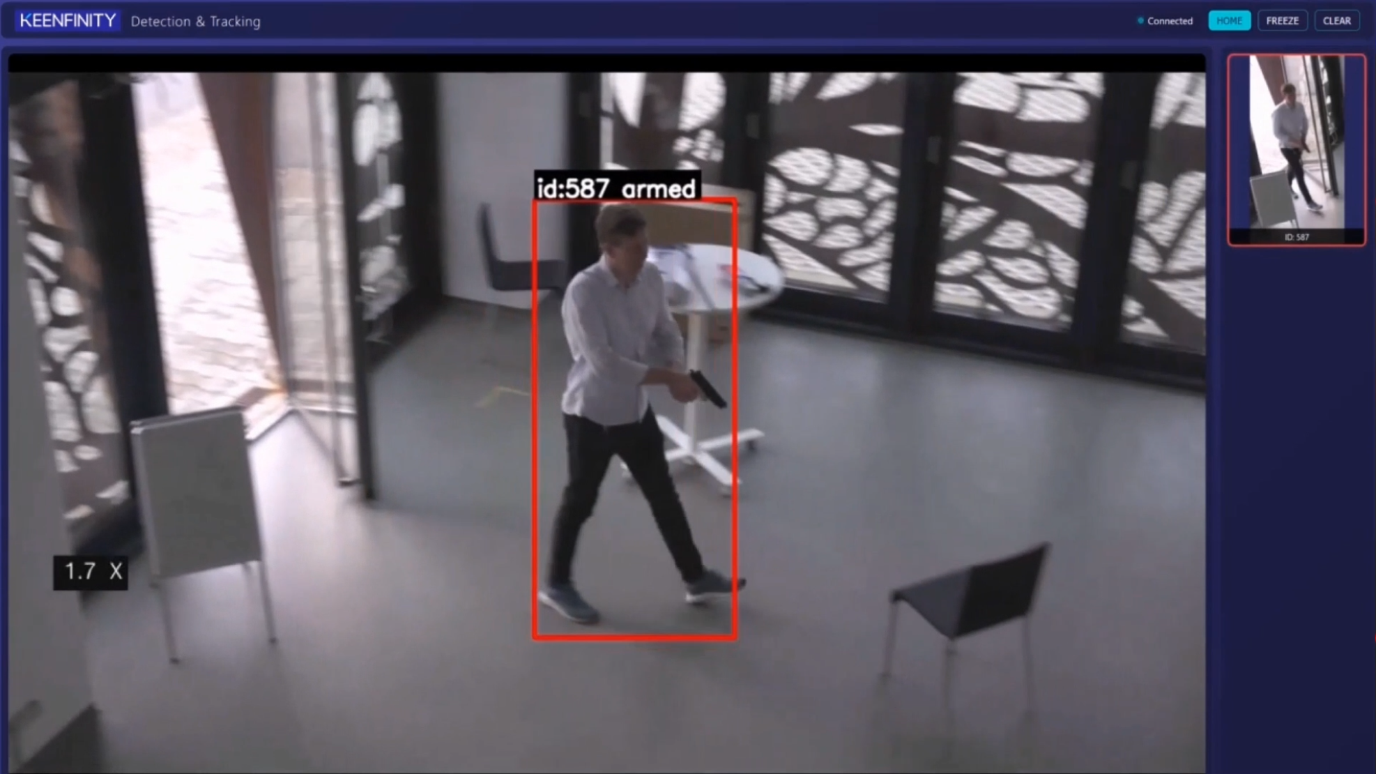 They previewed work pairing gun detection with PTZ (pan-tilt-zoom) cameras to extend detection into wide areas like parking lots, citing that a large share of incidents begin outside the building. The concept: use the PTZ to scan for people, zoom for pixel density, then run detection and auto-tracking without relying on an operator to manually drive the camera.
