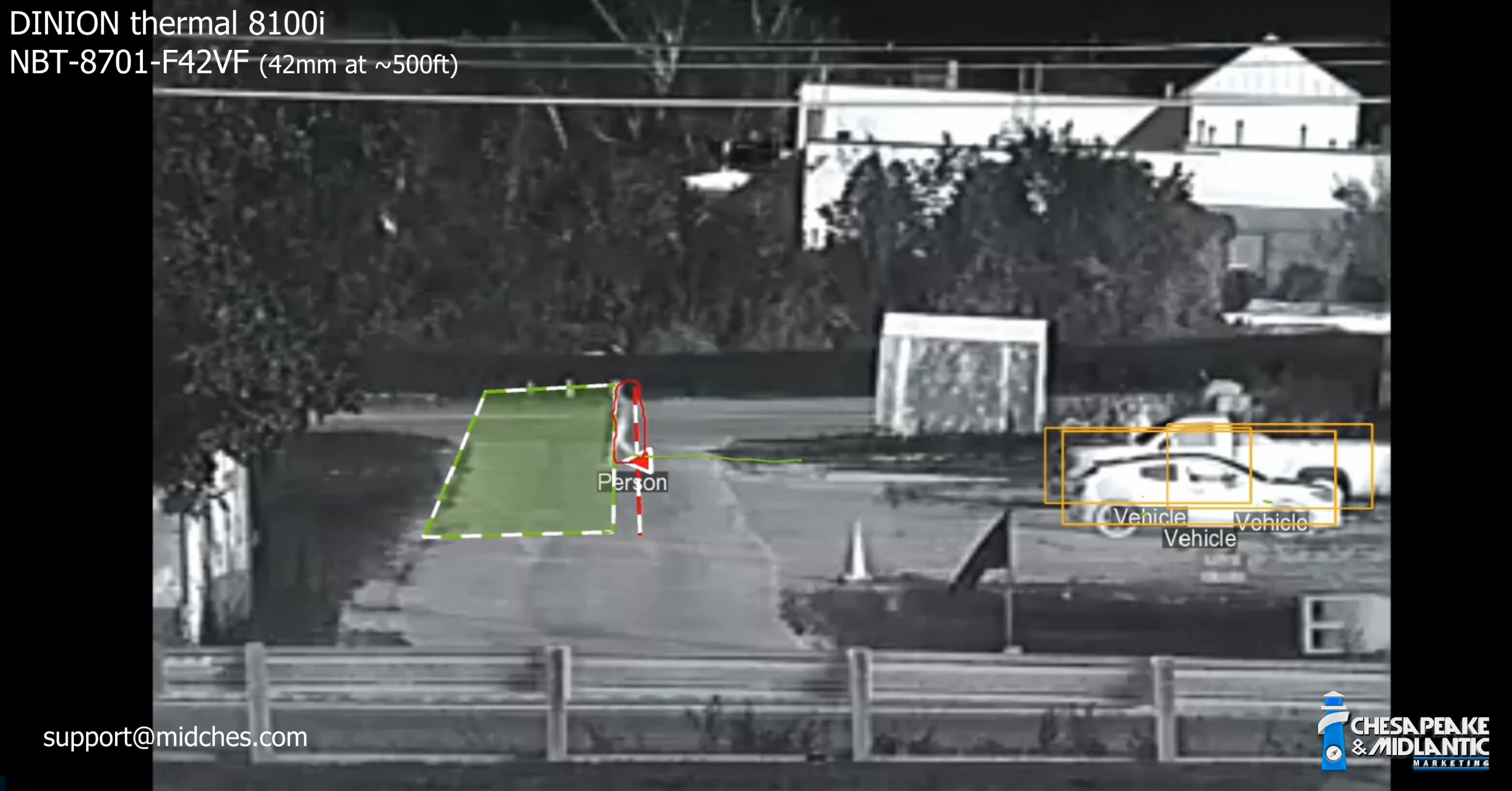 Long range tracking was viable in this test, which is ideal for long fence line perimeters like at a corrections facility, nuclear plant, airport, etc.. Caleb was detected and classified as a person at approximately 500 feet using the DINION thermal 8100i with a 42 mm fixed lens.
